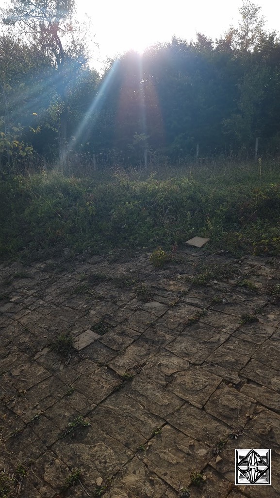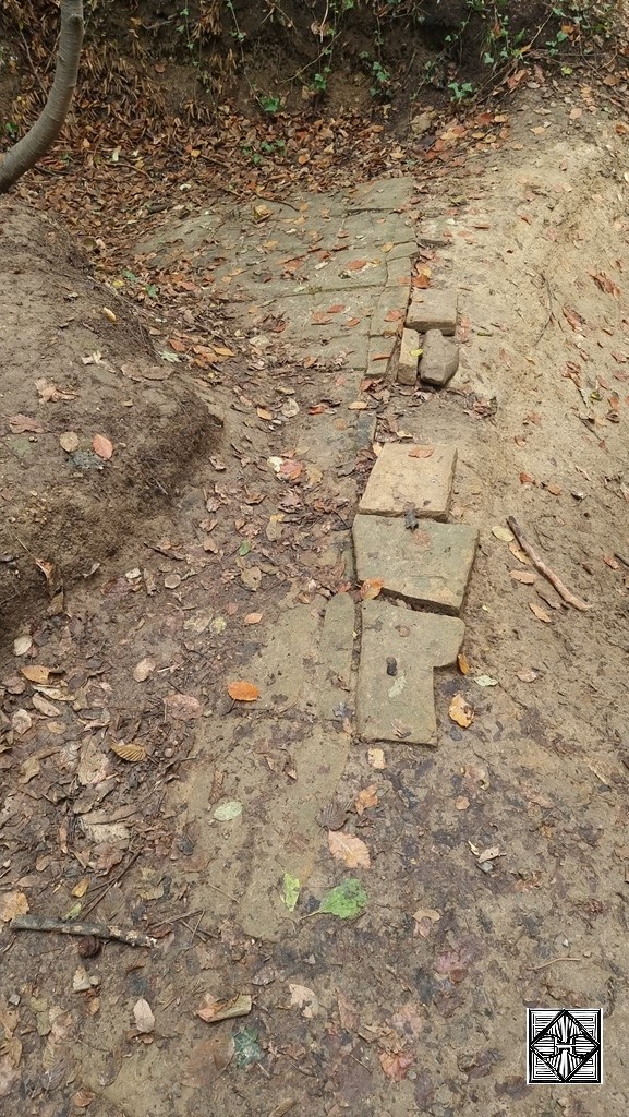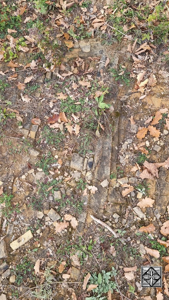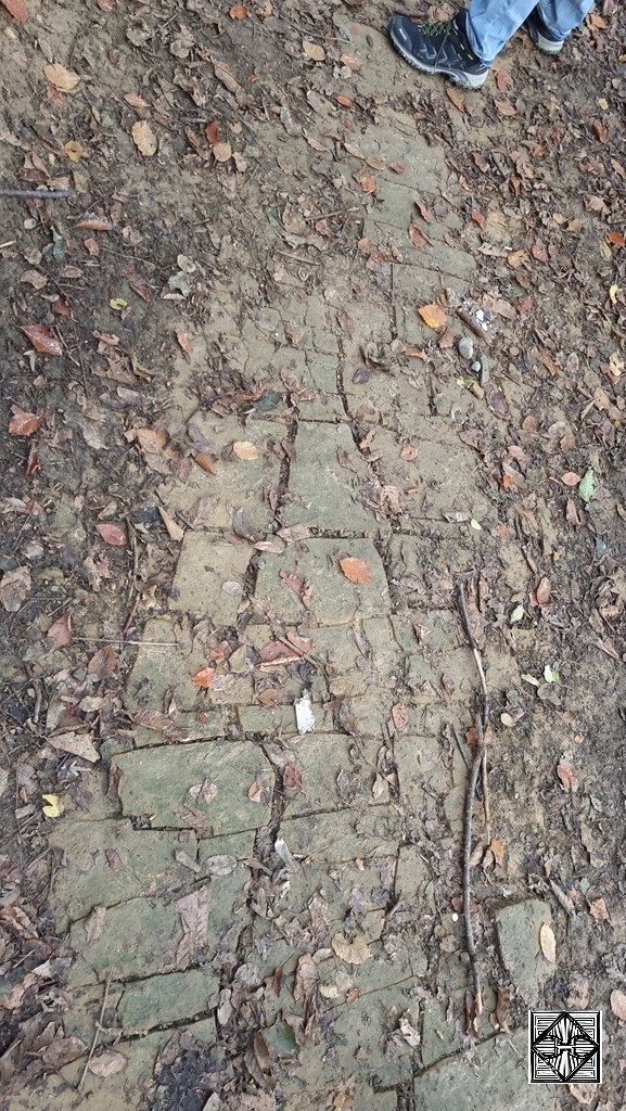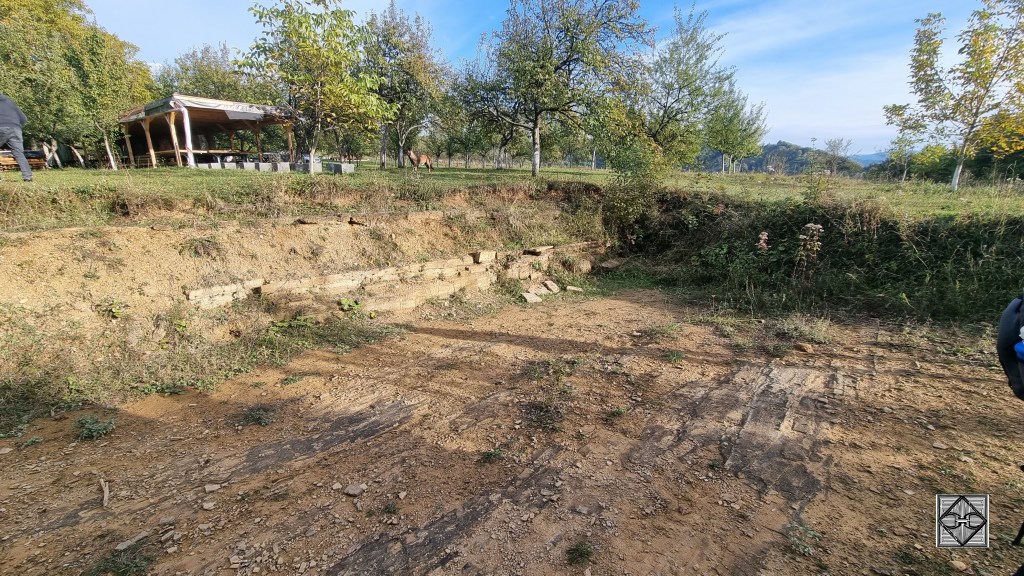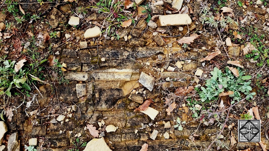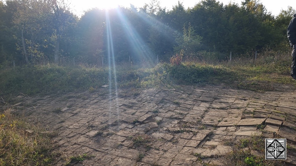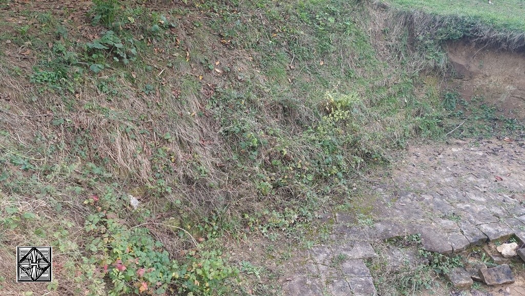 Wieder hinaus aus dem Wald auf die Wiese ein paar Meter in südöstlicher Richtung findet man zwei weitere breite Ausgrabungsstreifen von etwa 8×5 und 10×4 Metern, sowie eine etwa 20 Meter lange freigelegte – ich sage mal – Straße. Penibel aneinander gereihte Steinkacheln, die den Boden bedecken – das kann nicht natürlich sein. Erkennbar sogar Reste eines historischen „Fliesenklebers“ aus Kalkstein.