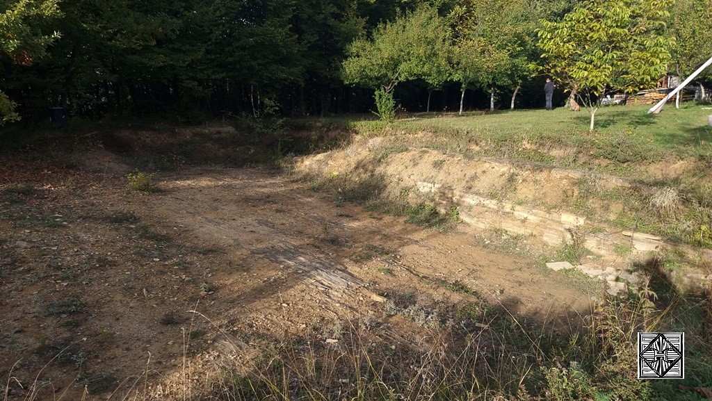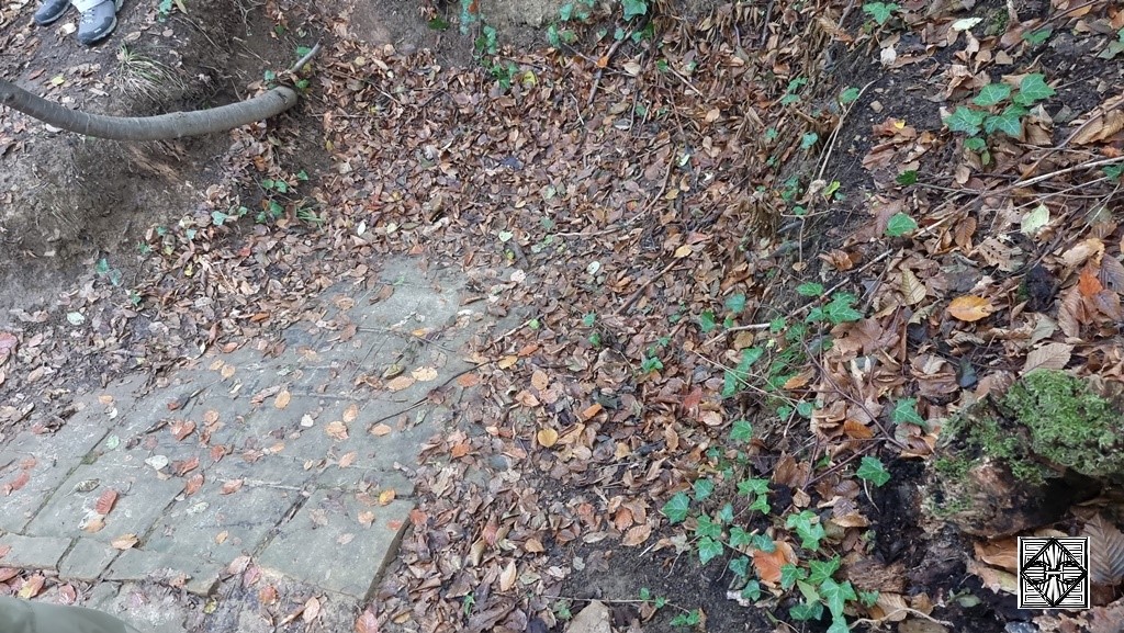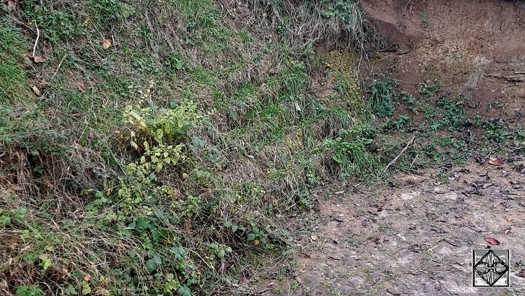 Gleich vor dem selbst-gebastelten Unterstand befindet sich eine Ausgrabung von etwa 5×5 Metern und 2-3 Meter Tiefe …es wurden Stufen, Boden und der Eingang zu einem Schacht freigelegt. Dann wurde aufgehört zu graben, als auch zu schützen und ein großer Teil ist schon wieder natürlich zugewachsen. Dennoch ist alles noch sehr klar zu erkennen – auch die Stufen, welche bereits wieder mit Gras bewachsen sind. Gar nichts Natürliches hier!
