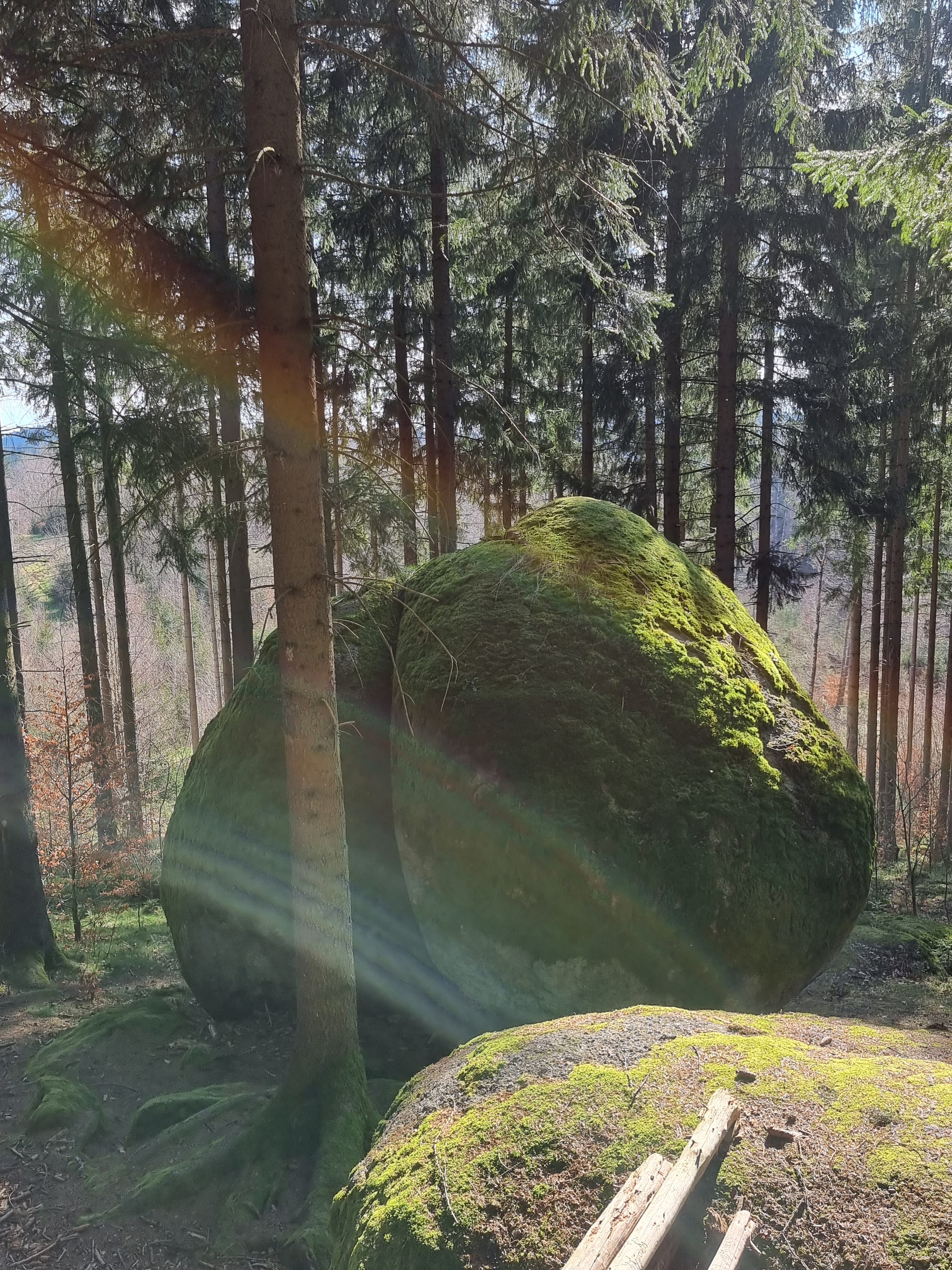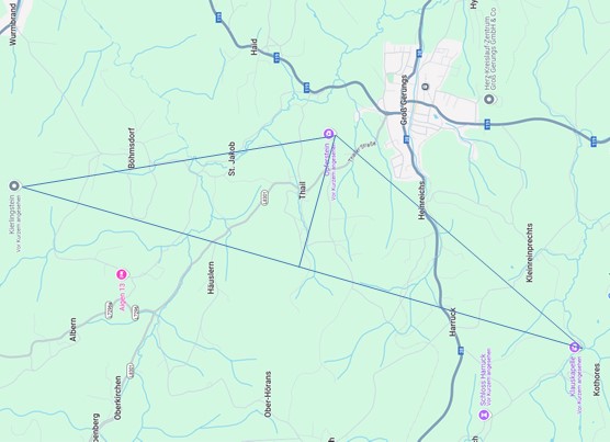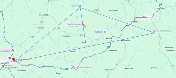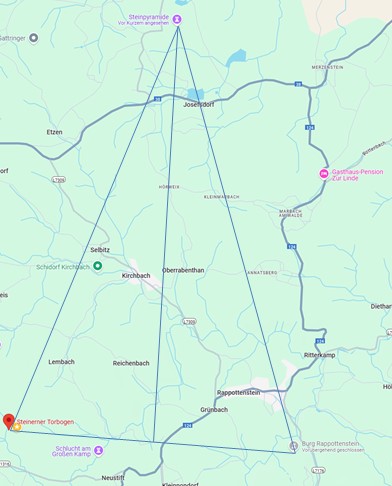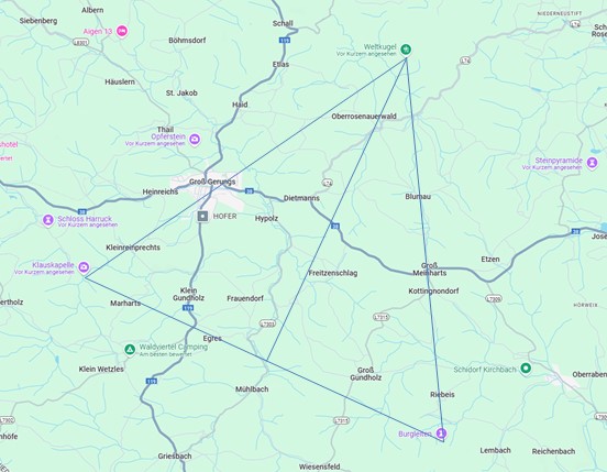 Mai und Juni 2023 – nach meinem ersten Fund eines gleichschenkeligen Dreiecks in der „Energie-Arena“ Groß Gerungs, bin ich neugierig geworden. In dieser Gegend gibt es, außer der Steinpyramide, Opferstein samt Summstein und der Weltkugel, nicht nur viele andere auffällige Stein-Formationen, wie etwa den „Kierlingstein“ oder einen Wackelstein, sondern auch auffällig viele Burgruinen. Ich machte mich weiter auf die Suche nach „heiliger Geometrie“ im Waldviertel.