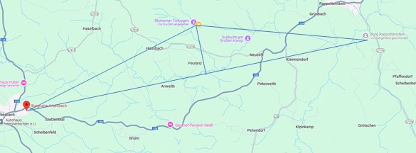 Ich erkundete die Gegend Groß Gerungs und arbeitete zeitgleich mit Landkarten. Ausgehend von den fünf „offiziellen Steinformationen“ der Energie-Arena Groß Gerungs (Steinpyramide, Weltkugel, Opferstein, Kierlingstein und Wackelstein) und dem ersten gefundenen gleichschenkeligen Dreieck, hielt ich Ausschau nach anderen auffälligen Steinformationen, sowie alten Burgruinen – und davon gibt es dort jede Menge.