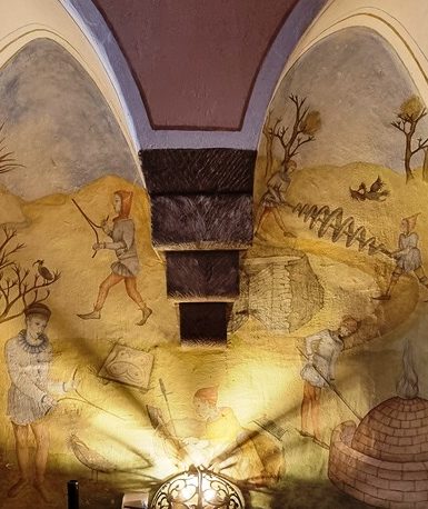 Treffpunkt am Stadtplatz Klosterneuburg, die klassische „Erstlings-Führung“ startet im Eingangsbereich des verbauten Grundstücks. Der Eigentümer erzählt von seiner Entdeckung. Blickfang ist ein aus der frühen Neuzeit an der rechten Mauer freigelegtes und rekonstruiertes Gemälde: die Darstellung der Anwendung eines Erdstalles. Was? Erdställe kann man „verwenden“? Oh ja, wenn man den alten Unterlagen der Kirche glaubt: der ehemalige Stiftsarchivar vom Augustiner-Chorherrenstift Klosterneuburg, DDr. Röhrig, fand im Stiftsarchiv rund 1m³ Unterlagen über diese und andere unterirdische Anlagen, sowie eine Anleitung zur Verwendung von Erdställen (Erdstall Video https://www.youtube.com/watch?v=sCbaUcviq4Y&t=1s kurzer Bericht dazu: https://alleszufall.com/2024/02/04/erdstalle-rund-um-vorau-steiermark/). Der Grundeigentümer der 12AP, sowie Familie Kusch konnten Einsicht in einige dieser Akte nehmen (im Kusch-Buch „Geheime Unterwelt“ findet sich eine Fotografie dieser Unterlagen), bevor diese vor einigen Jahren bereits vom Vatikan abgeholt wurden und seitdem als „verschwunden“ gelten.