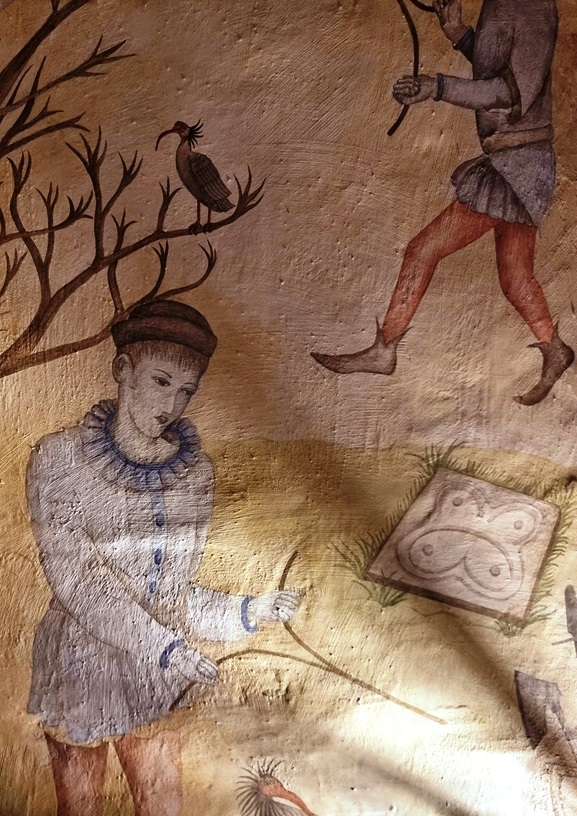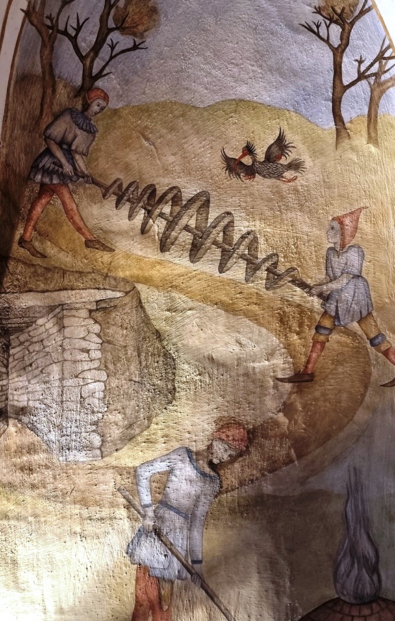 Das Gemälde beschreibt diesen Vorgang ziemlich gut – Wünschelrutengänger detektieren die Quarzader, zwei Erdställe an den jeweiligen Enden werden errichtet – mit Verschlusssteinen außen am Eingang, das Katalaun wird gespielt. Übrigens: die Kachel, scheinbar mit einem aufgemalten Schmetterling, stellt tatsächlich eine chladnische Klangfigur dar –  nämlich ein Fis. Alles Zufall oder was?