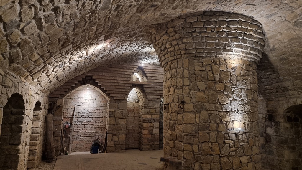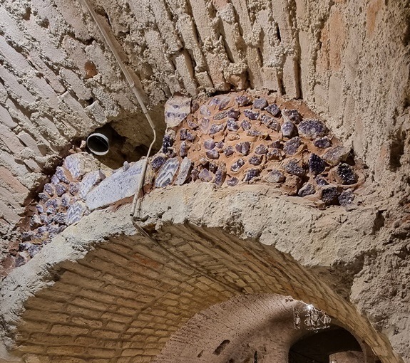 Nun wird man in den Keller geführt; der Eingang erinnert an einen klassischen Wein-Gewölbekeller. Schon am Fuße der Treppe angelangt, entdeckt man das erste Highlight: oberhalb des ersten Gewölbebogens, der gleichzeitig der erste sichtbare Türsturz zur Anlage ist, wurde ein Haufen Amethysten in die Wand eingearbeitet. Sofort fragt man sich, warum der Mörtel rot ist… dabei handelt es sich um sogenannten „Blutmörtel“  – ja, richtig, eingemischtes Blut. Dies soll vor Bösem schützen oder als Glücksbringer dienen … vor was sollte man sich schützen …?