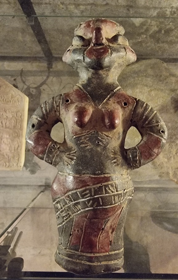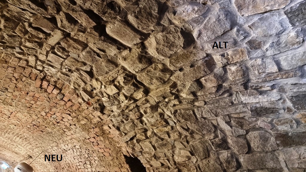 So wie fast jedes alte Gemäuer (in diesem expliziten Fall aus dem Neolithikum), wurde auch dieses in späteren – römischen – Zeiten übernommen. Dies erkennt man am Übergang der Ziegelwand-Verarbeitung: ganz klar – auch für einen Laien –  erkennbar die Trennung zwischen alt und neu.
