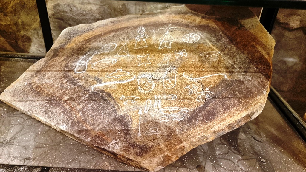 Steinplatten mit eingeritzten Darstellungen: darunter ein menschlicher Kopf und ein Langschädel daneben, etwas, zu dem wir heute UAP oder UFO sagen würden, sowie die Darstellung einer Glühbirne – Drähte verbinden die Birne mit einem Gefäß (dazu noch mehr etwas weiter unten).