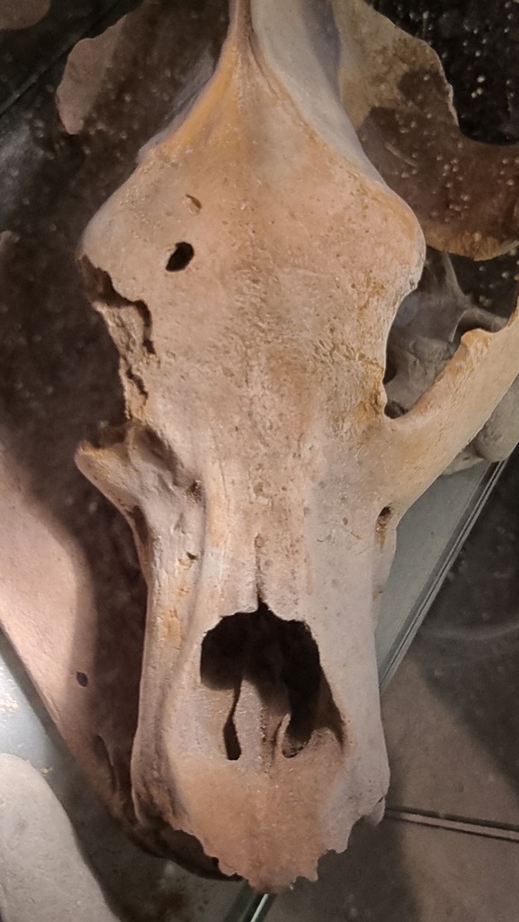 Ein Schädel eines Höhlenbären-Skeletts. Obwohl das schon wunderlich genug ist (denn die Höhlenbären sind vor mindestens 15.000 Jahren ausgestorben – in der österreichischen Gegend wahrscheinlich schon viel früher), findet man an der Stirn ein Eintritts- und am Jochbein ein Austritts-Kugelloch. Nähere Untersuchungen von verschiedenen Laboren, darunter führende Forensiker, ergaben, dass die Schusslöcher durch ein Hochgeschwindigkeitsgeschoß entstanden sind. Alles andere hätte nicht zu so einem sauberen Durchschuss geführt. Außerdem lebte der Höhlenbär danach noch rund vier Jahre weiter, das zeigte sich an der entdeckten Kallusbildung.