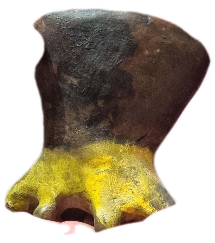 Ein Gefäß mit einem seltenen Gelb bemalt – Cadmiumgelb. Dazu mehreres: dieses seltene und äußerst teure Gelb findet man heutzutage nur mehr in Brasilien – dazu muss man rund 15 Tonnen Gestein verarbeiten, um 1 Gramm dieses Gelbs zu produzieren. Der Inhalt des Gefäßes wurde untersucht: es ergab, dass sich feinstes schwarzes Eisenpulver darin befand (reines Eisen wird lt. Wissenschaft seit max. 3.500 Jahren verwendet).