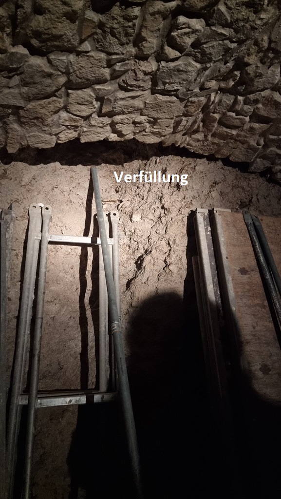 Bei einem der vielen endlosen Tunneln lässt sich gut die von der Kirche dazumal beauftragte Verfüllung erkennen: Geröll, Lehm und Steine sind bis an die Decke penibel gestapelt bzw. eher gestopft. Dieser Anblick lässt nur erahnen, welche mühevolle Arbeit der Grundstückseigentümer und seine vielen Helferleins (einschließlich Fam. Kusch) in dieses unglaubliche Projekt jahrelang gesteckt haben.