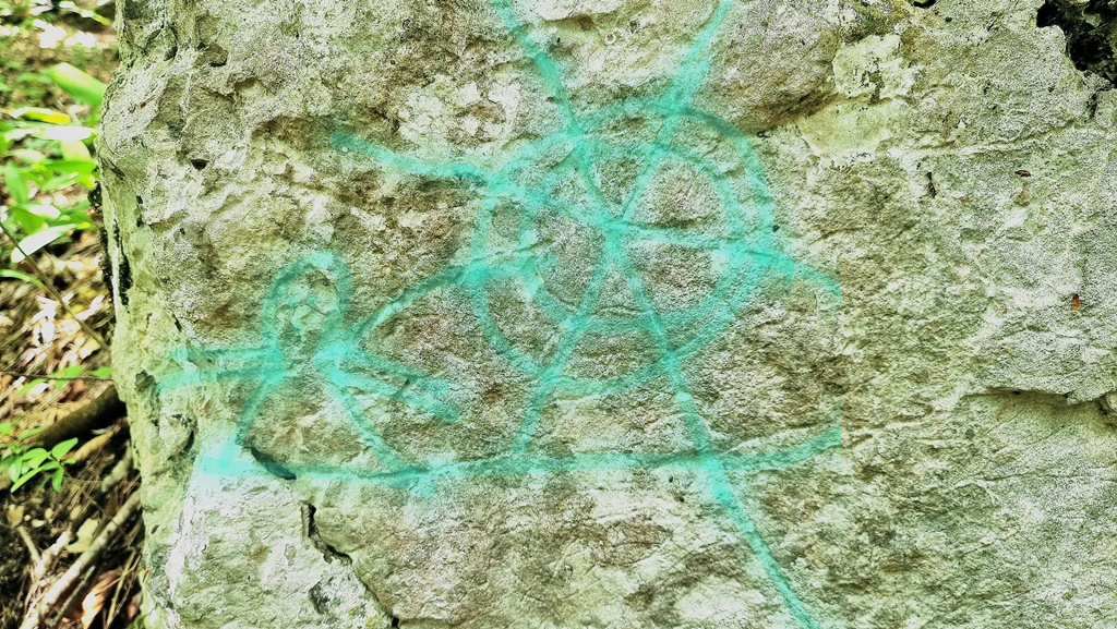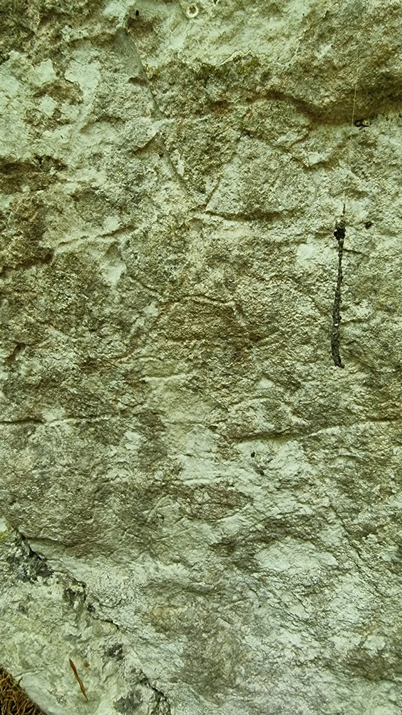 Oberhalb der Myrafälle, im Wald knapp unter der Bundesstraße L4008, wo sich einige Wanderwege kreuzen, fiel mir ein Felsbrocken neben dem Waldweg besonders ins Auge. Die Seite des Felsens, die zum Weg zeigt, war nicht sehr auffällig, die dem Weg abgewandte jedoch sehr. Bei näherem Betrachten erkannte ich deutliche, sichtlich uralte Ritzungen, sogenannte Petroglyphen. Am linken Rand des Steins eine Gestalt, die ein Kleid zu tragen scheint und die ihre Arme horizontal nach links und rechts ausstreckt. Mit etwas Fantasie erinnerte mich diese an die kleinen Engel, wie sie Kinder schlicht skizzieren, oder an solche, wie man sie aus Stroh an den Weihnachtsbaum hängt. Rechts neben der Gestalt sah ich eine kreisförmige Darstellung, die an ein Rad mit Speichen erinnert, Kreise, die durch Linien, wie eine Torte, in Stücke unterteilt waren, wobei die Linien über den äußeren Rand der Kreise hinausragen. Unter den beiden Darstellungen eine Linie, die dem Anschein nach einen festen Untergrund darstellen soll, wobei die Figur auf dem Boden steht, der „Linien-Kreis“ jedoch über dem Boden schwebt.